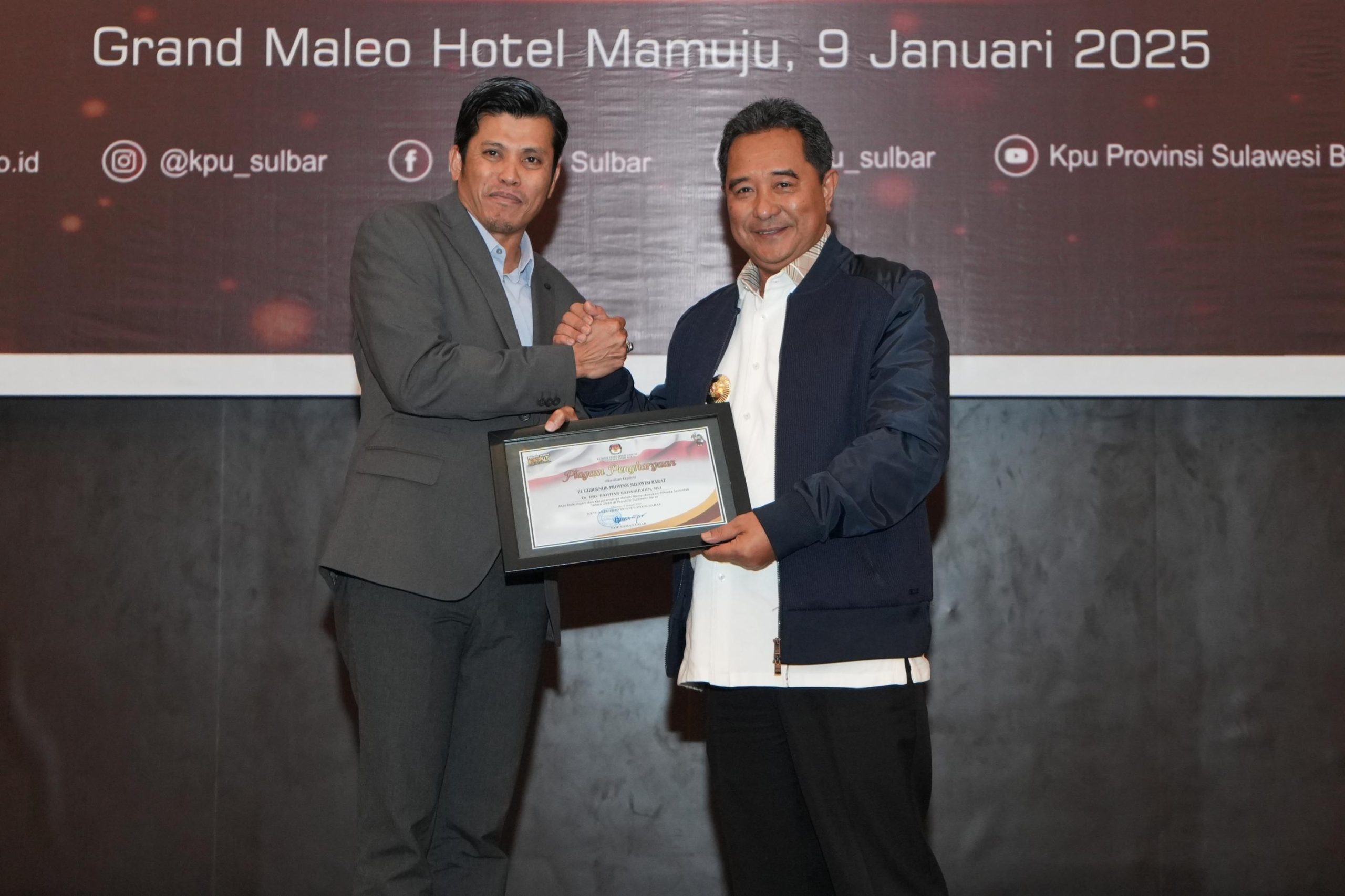 MAMUJU, Maleosulbar.com — Penjabat (Pj) Gubernur Sulawesi Barat (Sulbar), Bahtiar Baharuddin mendapat piagam penghargaan dari Komisi Pemilihan Umum Daerah (KPUD) Provinsi Sulbar.