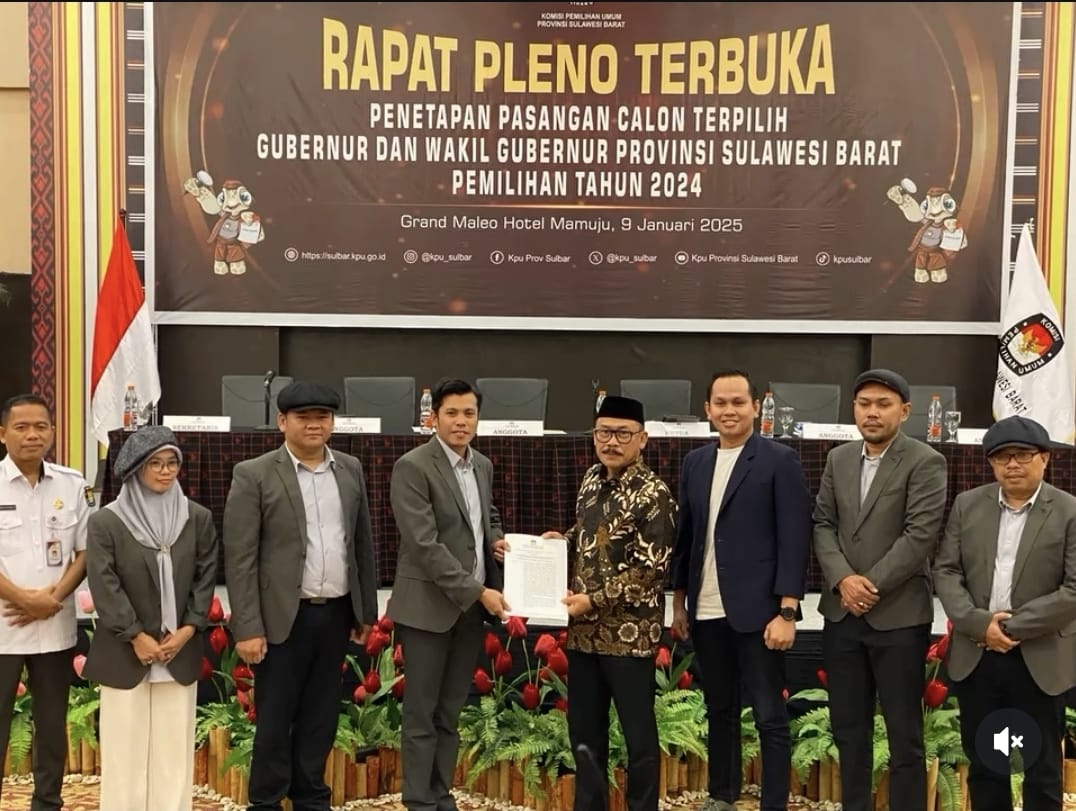 Mamuju, Maleosulbar.com – Komisi Pemilihan Umum (KPU) Provinsi Sulawesi Barat secara resmi menetapkan pasangan calon gubernur dan wakil gubernur terpilih pada pemilihan tahun 2024, SDK-JSM, dalam Rapat Pleno Terbuka yang digelar di Ballroom Grand Maleo Hotel, Kamis (9/1/2025).